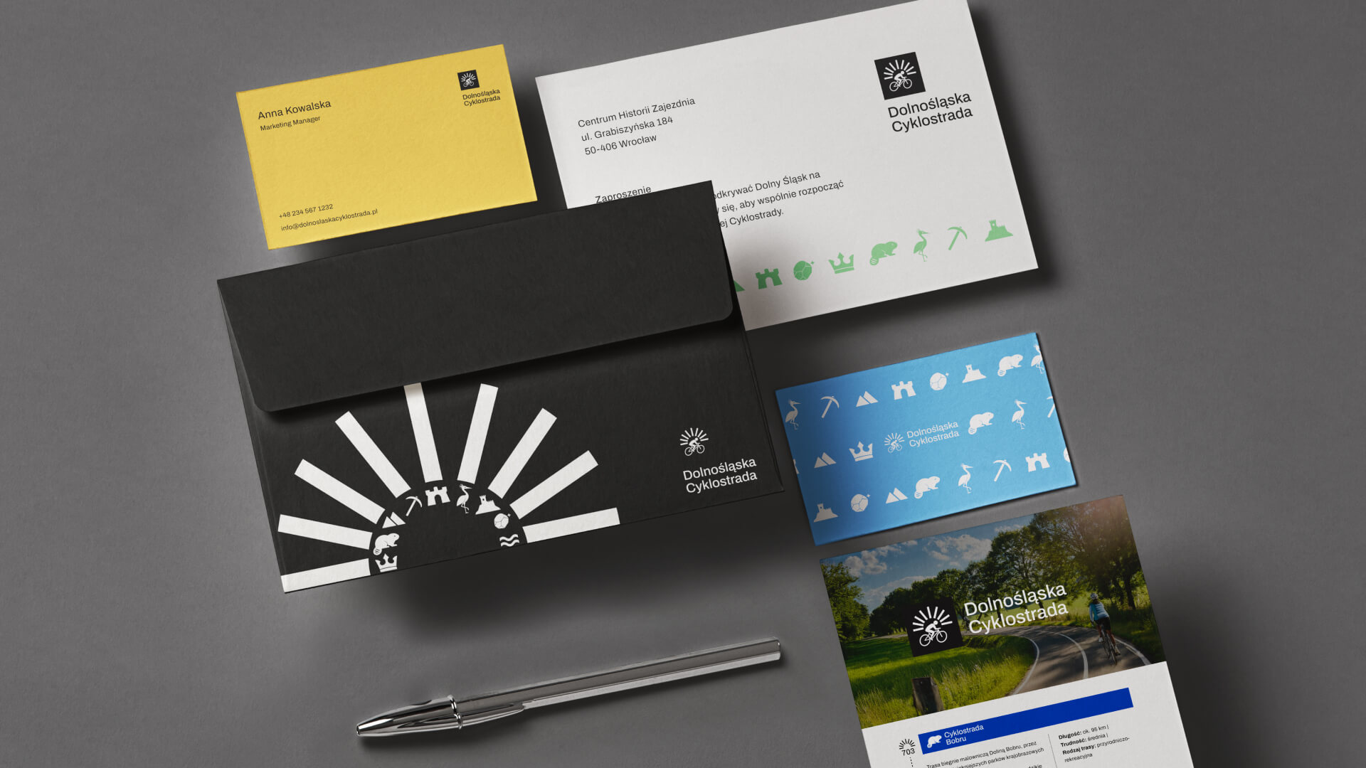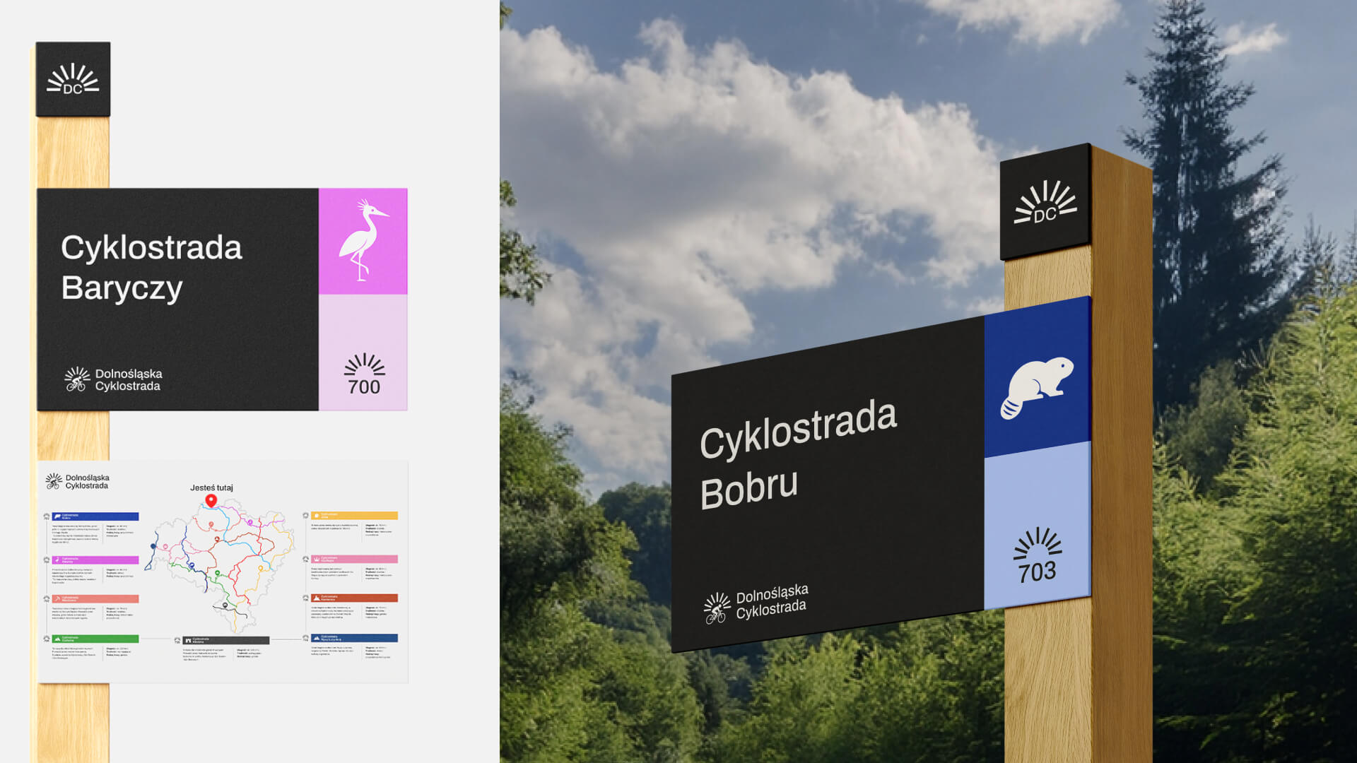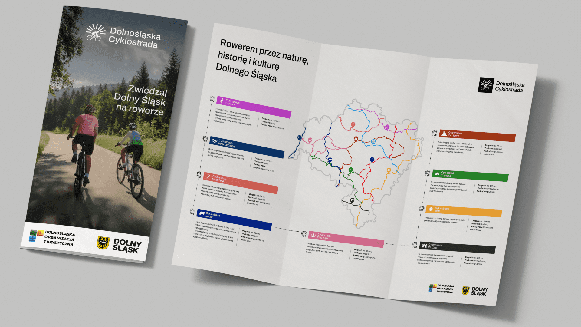 The visual identity of the Dolnośląska Cyklostrada was designed as a flexible and coherent system that connects all routes while allowing each of them to express its own character. It supports navigation, strengthens recognition, and helps build an emotional connection with the region. The system is scalable and ready to grow alongside the Cyklostrada, adapting to new routes, media and audiences.